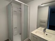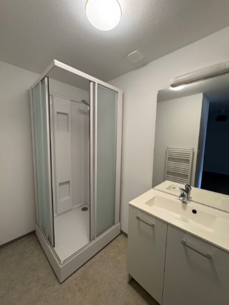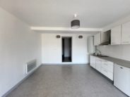 A louer à Montmorot, 1 Rue du Stade, appartement F1 bis avec petite terrasse, composé de : cuisine équipée ouverte sur séjour, chambre, salle de bains avec douche, wc.