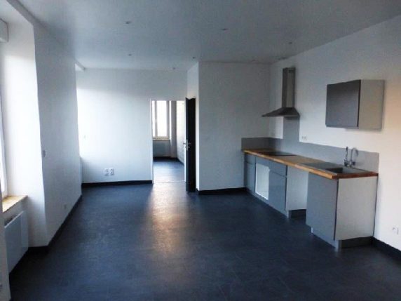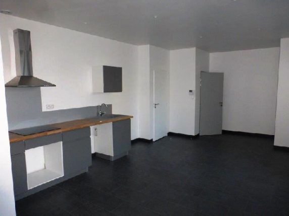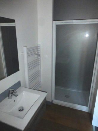 A louer à Lons, 18 Boulevard Gambetta, appartement F1 BIS composé de: cuisine équipée (plaques de cuisson, hotte, rangements) ouverte sur séjour, chambre, salle d’eau (douche) avec rangement, WC.