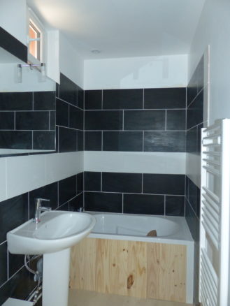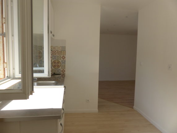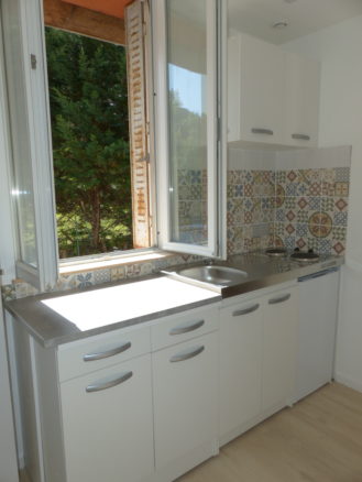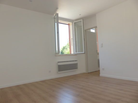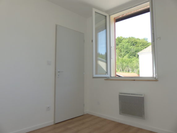 A louer à Moirans-en-Montagne, 11 Montée du Château, appartement F2 composé de : cuisine équipée, salon-séjour, une chambre, salle de bains, wc.