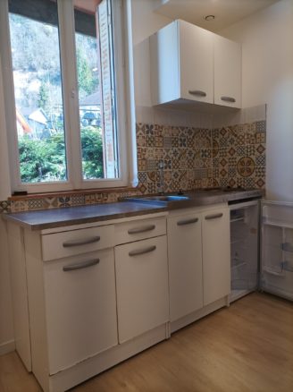 A louer à Moirans-en-Montagne, 11 Montée du Château, appartement F2 composé de : cuisine aménagée, salon-séjour, une chambre, salle de bains, wc.