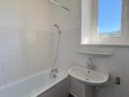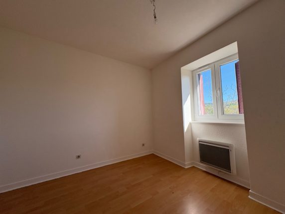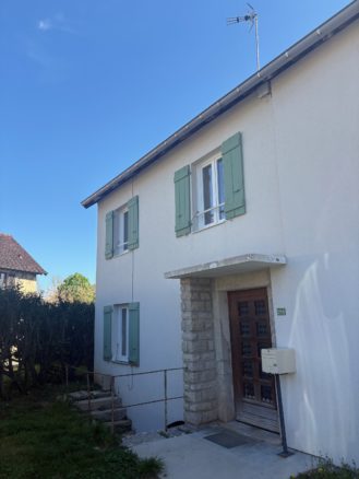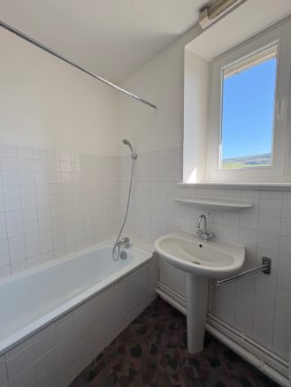 A louer à Domblans,  204 Rue de l’Eglise, appartement type F2 composé : entrée dégagement couloir, cuisine, séjour simple, une chambre, salle de bains avec baignoire, wc,