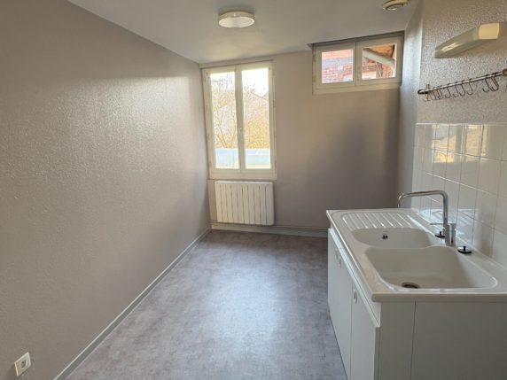 A louer à Voiteur, 6 Grande Rue, appartement F2 rénové composé de : entrée dégagement – Cuisine – Séjour -Chambre 1, Salle de bains – wc.