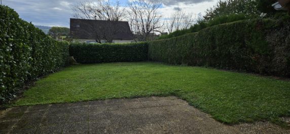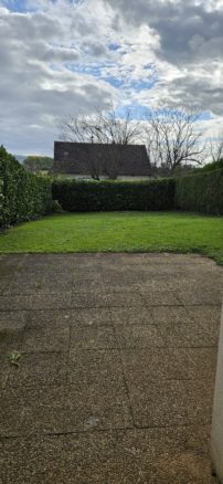 Entrée avec placard, cuisine équipée, buanderie – wc avec lave mains, séjour donnant accès à la terrasse avec store banne et au jardin.