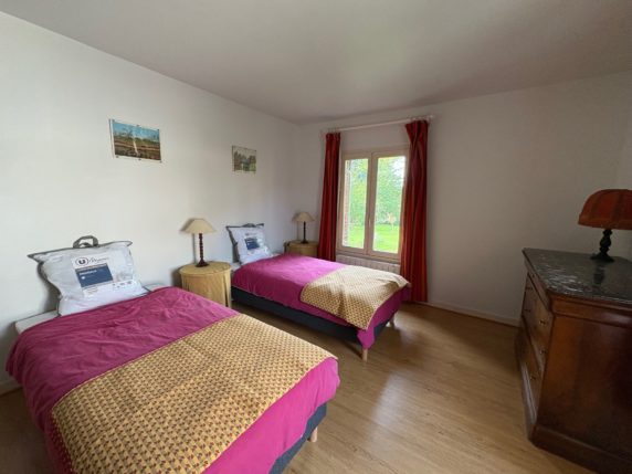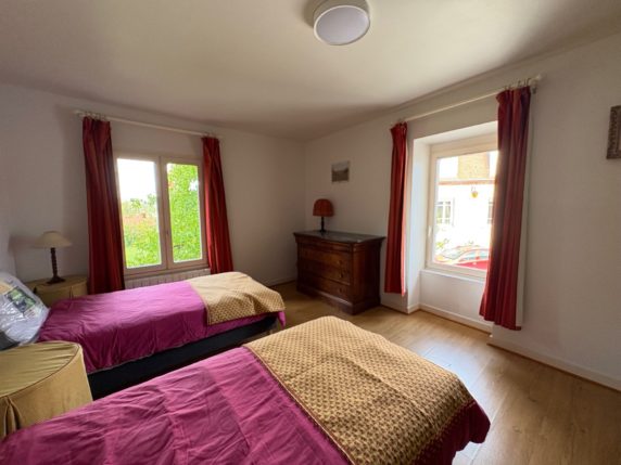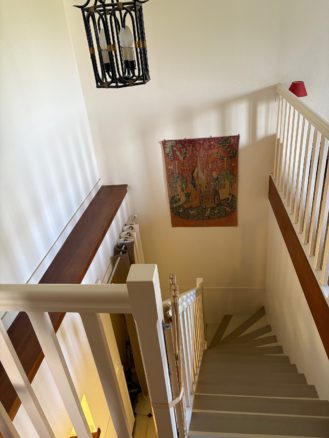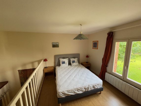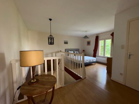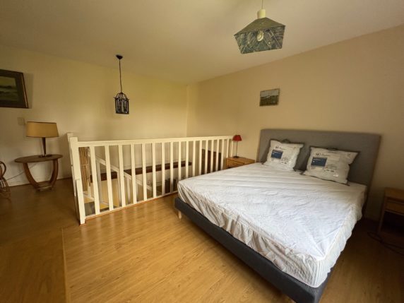 A l’étage: grande mezzanine avec lit, salle de bains et une chambre.