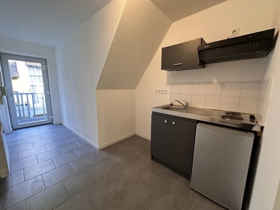 A louer à DOLE, 9 rue de l’Orveau, appartement F1 rénové, au centre-ville de Dole, proche de la place Grévy. Il se compose d’une cuisine équipée (plaques de cuissons, réfrigérateur et hotte), pièce à vivre, salle d’eau avec douche et WC. Cave.